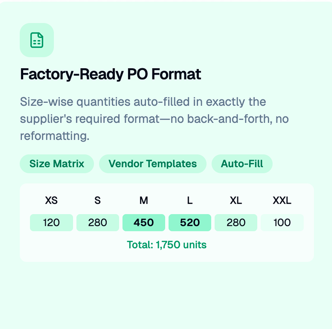 Auto-fills size-wise quantities in exactly the supplier’s required format.