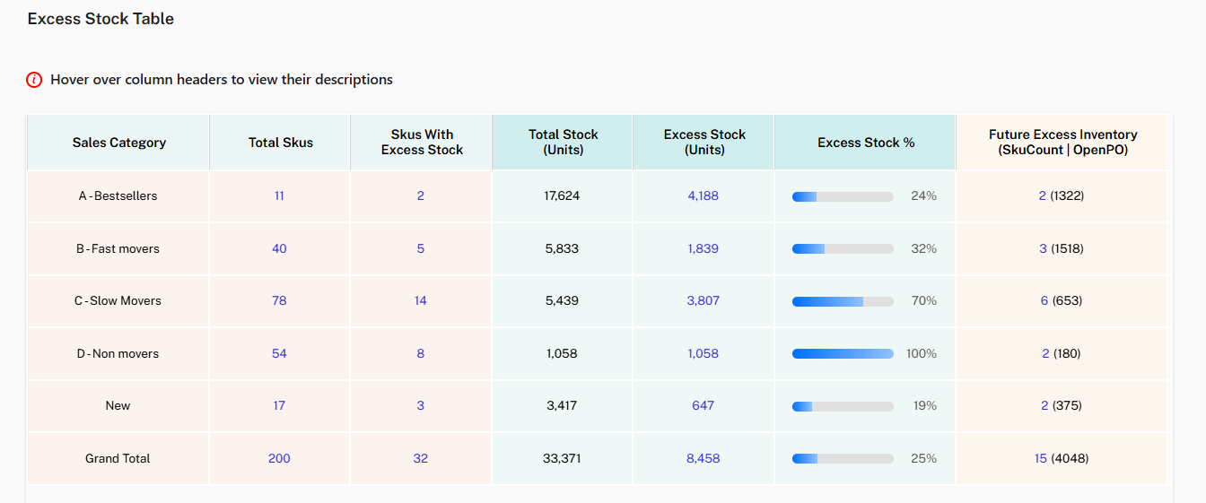 Another useful metric is identifying excess inventory across ABC classifications. ABC classification groups products based on their contribution to overall sales or revenue. When inventory levels are viewed alongside these categories, businesses can quickly identify problems such as:
